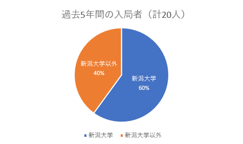 直近5年間(2021年ー2025年)の入局者は20人で,新潟大学以外の大学出身は40%(8人)です.