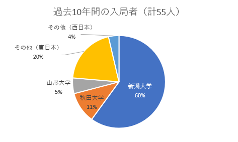 直近10年間(2016年ー2025年)の入局者は55人で,新潟大学以外の大学出身は40%(22人),年間平均5-6人入局しています.